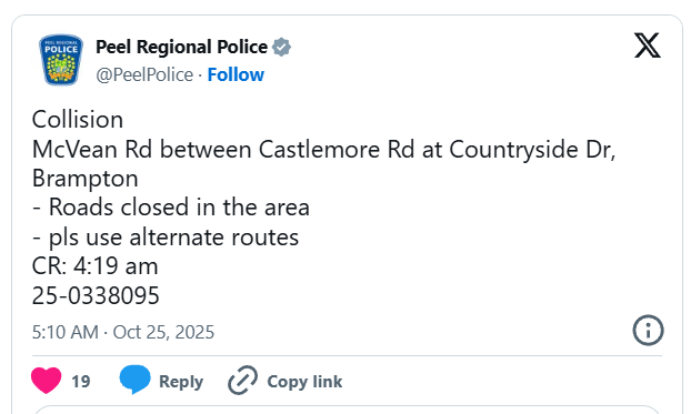 吉普车撞得面目全非:宾顿凌晨车祸两人送医,道路封闭 发布: 2025-10-26 皮尔区警方表示,宾顿凌晨发生后,多条道路已被封闭。 警员于凌晨4点19分左右赶到McVean Road介于 Castlemore Road和Countryside Drive之间的区域。 警方为调查封闭了周边道路,并建议驾驶者改走其他路线。 免责声明:本文仅代表作者个人观点,与华侨网无关联。其原创性及文中陈诉内容未经本网证实,对本文内容、文字的完整、真实性,以及时效性本网部作任何承诺,请读者自行核实相关内容。如发现稿件侵权,或作者无意愿在华侨网发布文章,请版权拥有者通知华侨网处理。