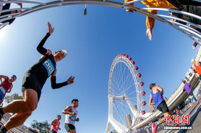10月26日,参赛选手途径“天津之眼”摩天轮。当日,2025天津马拉松鸣枪开跑。记者 佟郁 摄