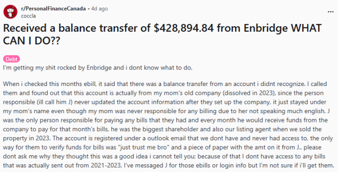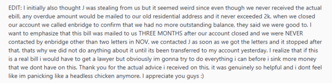 我一开始也怀疑是不是 J 盗用我们的钱,但又觉得很奇怪。虽然我们一直没收到电子账单,但任何逾期欠款都会寄到我们旧的住址,以前从来没有超过 $2,000。我们关闭账户时还特地打电话给 Enbridge 确认,他们说我们已经结清了所有欠款。