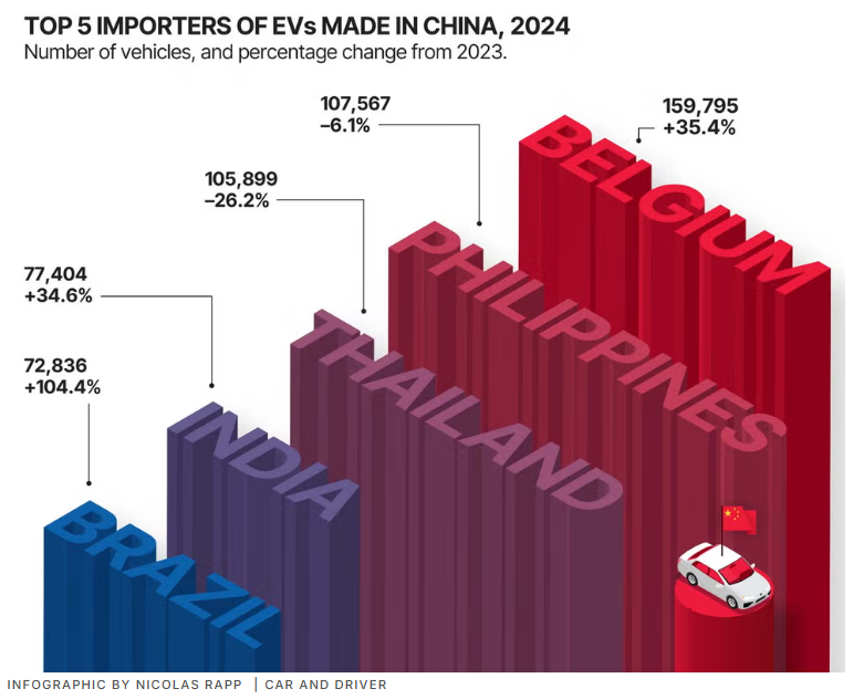 2024年中国制造电动汽车的前五大出口国,分别是比利时、菲律宾、泰国、印度和巴西。