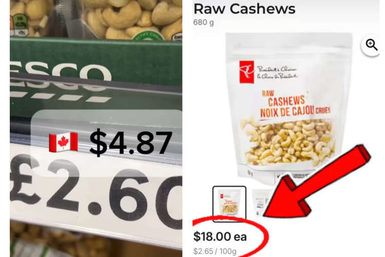 接下來,凱爾買了一袋腰果,在Tesco 售價2.60英鎊(4.86加元)。在Loblaws,一袋100克的腰果售價為18加元。