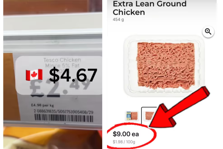 然後他在 Tesco 以2.49英鎊(4.65加元)的價格買了一盒超瘦雞肉沫,又以1.80英鎊(3.36加元)的價格買了一包培根。在Loblaws,一盒超瘦雞肉沫要花9加元,而一包培根則要花10加元。