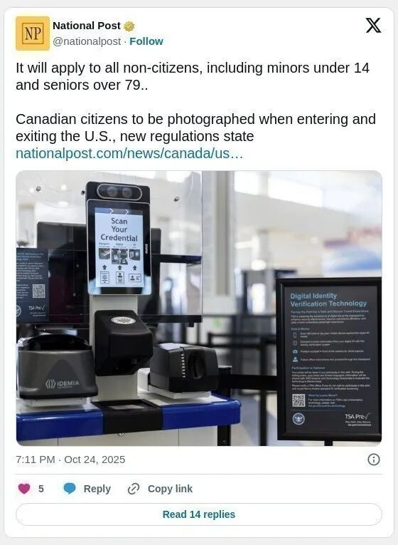 (加西网综合)作为国土安全部新规定的一部分,美国将很快要求包括加拿大人在内的所有非美国公民在出入境时必须拍照,包括 14 岁以下的未成年人和 79 岁以上的老人。
