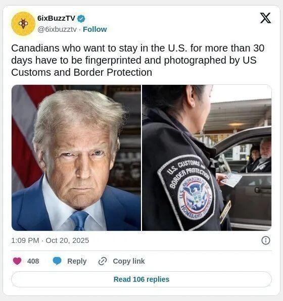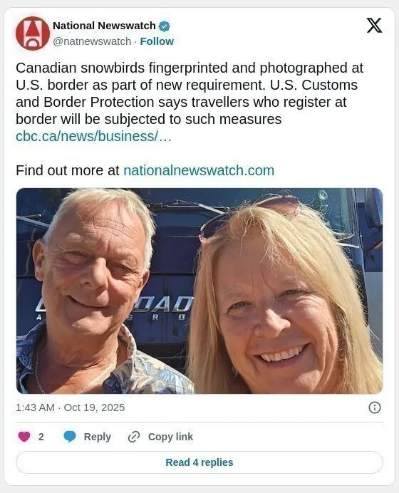 (加西网综合)随着美国国土安全局即将推出要求非公民出入境必须拍照的新规,多名加拿大“雪鸟族”(snowbirds)近日反映,在通过美国陆路边境登记冬季长居时,被边境官员拍照并采集指纹。美国海关及边境保护局(U.S. Customs and Border Protection,简称 CBP)向加拿大广播公司(CBC)证实,这一程序已成为新常态。