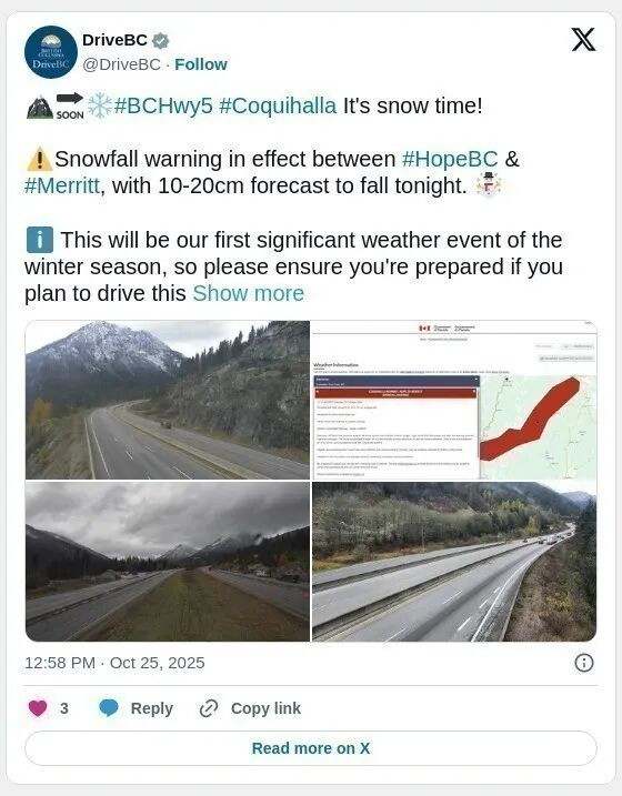 同时,加拿大环境部对Coquihalla 高速公路的Hope 至 Merritt的路段发出的降雪警告已经生效。