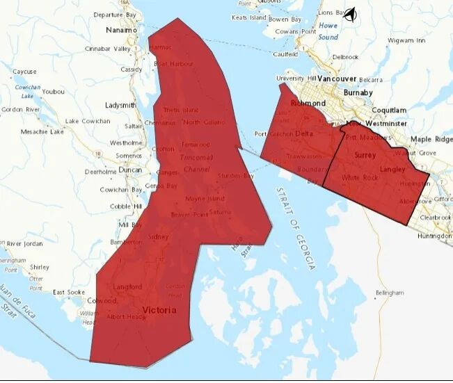 加拿大气象局于今天周六上午发布了大风警报,范围包括大温的素里、兰里、列治文和三角洲,以及大维多利亚地区和南部海湾岛屿。