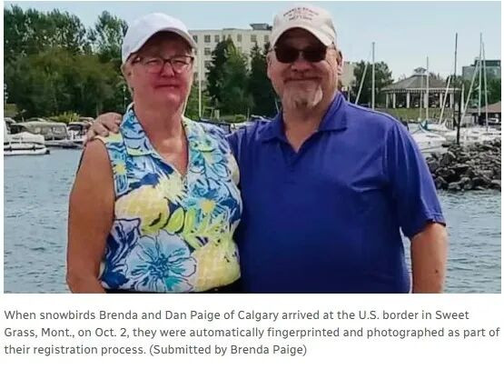 来自卡尔加里的布兰达与丹·佩奇(Brenda and Dan Paige)夫妇 10 月 2 日从阿尔伯塔省甜草口岸(Sweet Grass, Mont.)入境时,被直接带往二次检查区,现场拍照、指纹录入,并支付 60 美元登记费。
