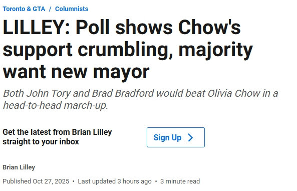 距离下届市政选举还有一年,市长(Olivia Chow)的民调陷入危机,多数选民认为“是时候让她下台了”。
