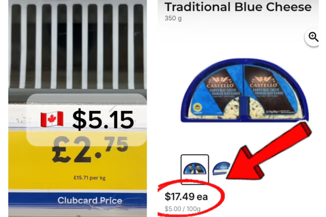 然后,他花2.75英镑(5.14加元)买了一些蓝纹奶酪(blue cheese),在加拿大,类似的产品要花17.49加元。