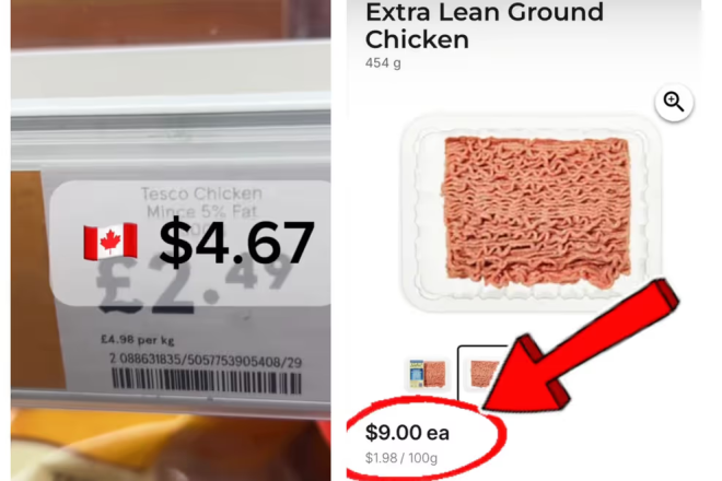 然后他在 Tesco 以2.49英镑(4.65加元)的价格买了一盒超瘦鸡肉沫,又以1.80英镑(3.36加元)的价格买了一包培根。在Loblaws,一盒超瘦鸡肉沫要花9加元,而一包培根则要花10加元。