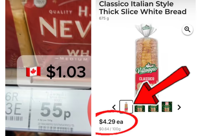最后,这位加拿大人在他的购物车里添加了一袋白面包,价格为 0.55 英镑(1.03 加元),这在 Loblaws 超市要花 4.29 加元。