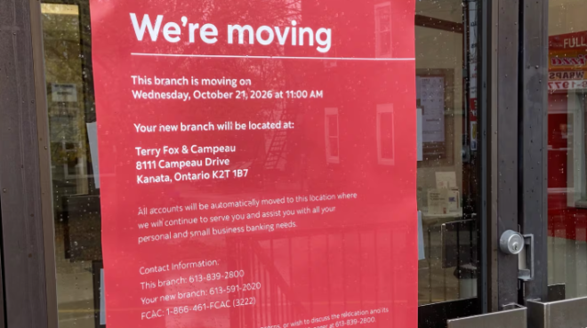 - 渥太华Carp分行(位于Donald B. Munro Drive):2026年10月21日关闭,业务迁至约13公里外的Terry Fox与Campeau分行。