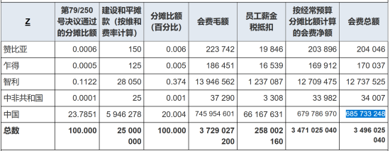 據聯合國介紹,中國是聯合國第二大會費分攤國,所分攤比額為20%,僅次於美國的22%,遠高於排在第三的日本的6.93%。