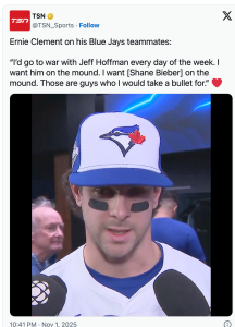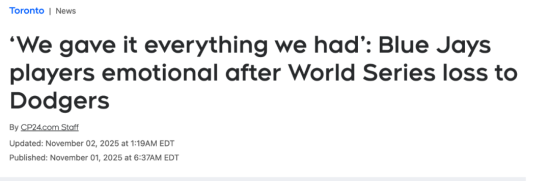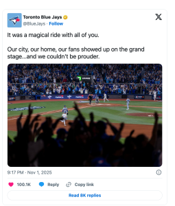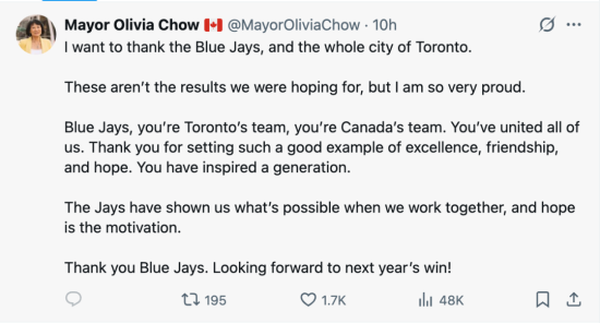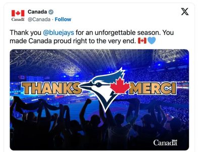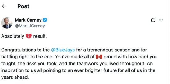 凌晨 1 點 15 分,加拿大聯邦政府在 X 上寫道:“謝謝多倫多藍鳥,帶給我們一個難忘的賽季。你們讓加拿大驕傲到了最後一刻。”