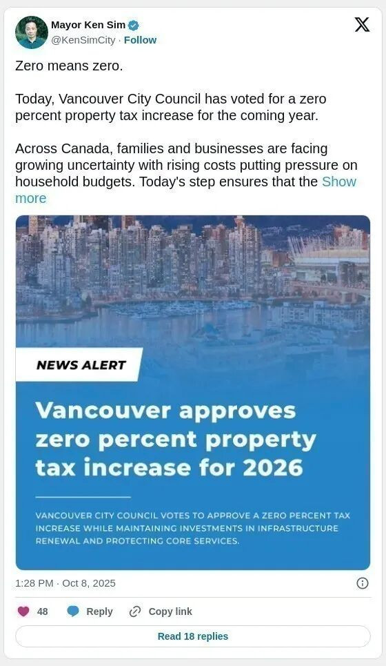 根据温哥华沈观键于10月8号发布的消息,称温哥华市议会投票决定,明年地税将保持零增长。