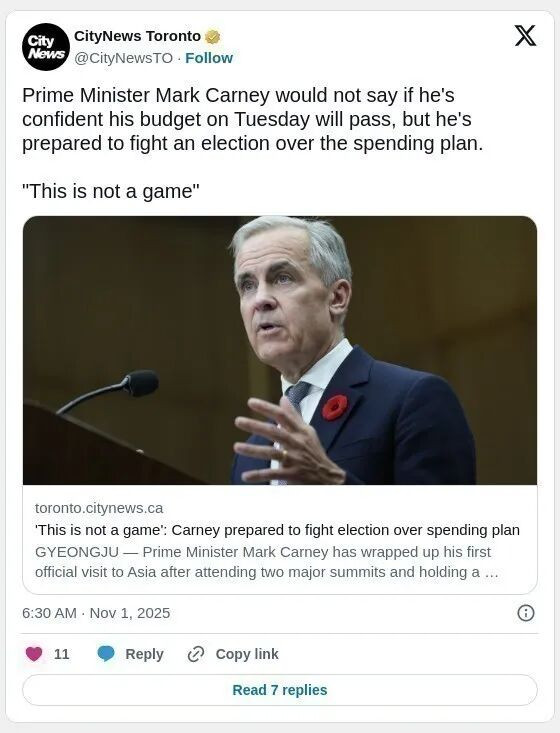 加国总理卡尼表示:这不是儿戏,若预算遭否决将准备迎战大选。他也誓言捍卫财政计划,称“百分之百相信预算方向正确”。