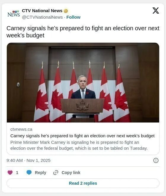 (加西网综合)加拿大总理马克·卡尼(Mark Carney)表示,如果国会否决其政府即将公布的联邦预算,他已准备好迎接一场大选。
