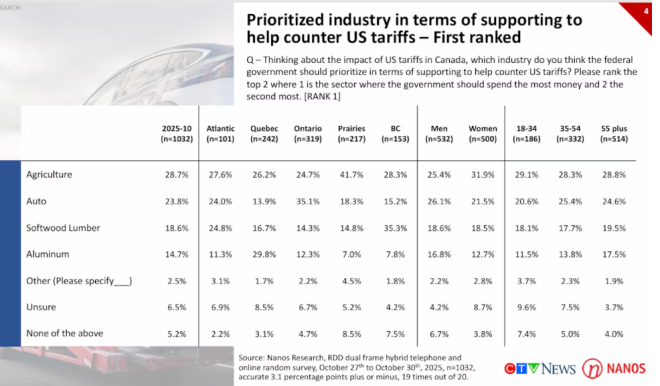 根据纳诺斯研究公司(Nanos Research)为CTV新闻所做的一项最新调查,加拿大人认为在应对美国关税影响时,联邦政府应优先扶持农业和汽车产业。