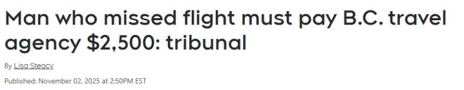 加拿大卑诗省一名男子因错过航班而申请退款,结果被裁定仍需支付这趟航班的费用。