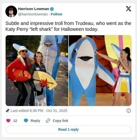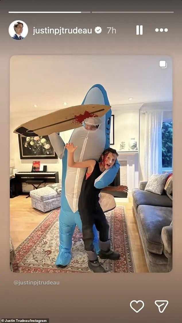曾于2015年至2025年担任加拿大总理折特鲁多写道:“和哈德里安一起准备过万圣节:他是冲浪者,我是鲨鱼”。