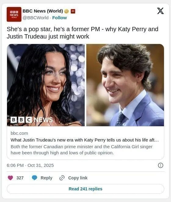 这一对几乎无人能预料到的组合:一位加拿大前总理和一位巡演全球、甚至抵达太空边缘的美国流行歌星,也霸占热搜。就连BBC都分析这两人为什么能走到一起。