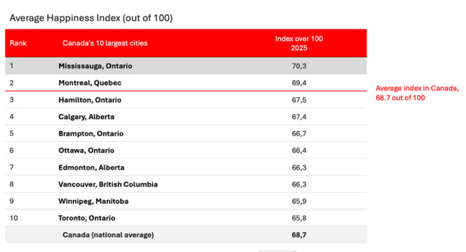 Leger对加拿大大城市的幸福感进行了排名,只有两座城市高于全国平均水平。安省密西沙加以70.3分位居榜首,其次是蒙特利尔(69.4分)和安省汉密尔顿(67.5分)。