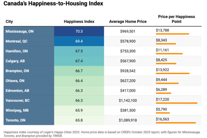 在密西沙加,平均房价为969,501加元,这意味着居民每获得一“幸福点”要花费约13,788加元。这几乎是蒙特利尔每幸福点价格的两倍(约8,343加元)。
