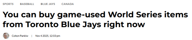 多伦多蓝鸟队的球迷请注意:现在有机会入手今年那段传奇世界大赛(World Series)征程中的实战纪念品!就是价格有点离谱…