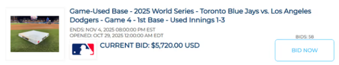 目前最贵的拍品是一垒垒包,来自第四场比赛。这块垒包在前三局比赛中使用过,而那场比赛蓝鸟以6比2取胜。当前出价为美金5,720元(约加币8,054.85元)。