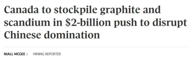 渥太华刚刚公布了全新20亿加元关键矿产投资计划,将开始囤积本土生产的石墨(graphite)和钪(scandium)。该计划旨在资助加拿大境内关键矿产矿山与加工厂建设,以挑战中国在全球关键矿产领域的主导地位,并缓解西方国家对供应短缺的担忧。