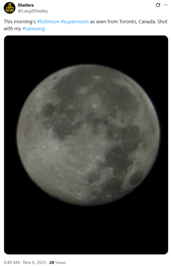 这次的满月距离地球只有356,980公里,是2025年三次超级月亮中最显眼、最接近的一次。11月的满月也被称作“海狸月(Beaver Moon)”,它象征着冬天来临、河狸开始筑巢的季节。