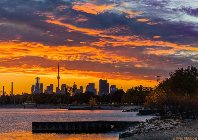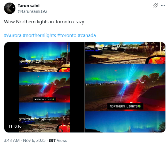 即便像多伦多这样人口密集、云层较多的城市,依然能看到绚丽的极光在夜空中“泼彩”。
