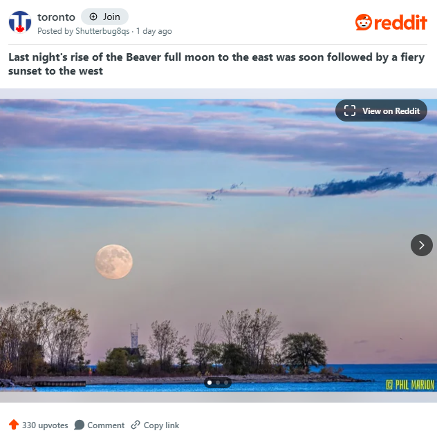 周三(11月5日)晚上,安省的社交媒体上被“超级月亮”和“北极光”的照片刷屏了——这天晚上,整个省份都迎来了罕见又壮观的“双重天象盛宴”。