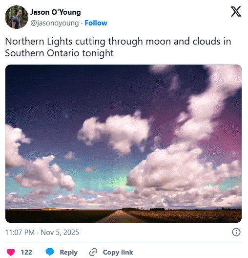 通常来说,超级月亮已经足够吸引人拿起相机对着天拍,但这次更特别——因为同一晚,极光也出现在安省的夜空中,绿色和粉红色的光带在天空中交织闪动,让人叹为观止。