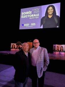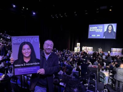 【時報訊】11月2日滿地可市選舉,三名曾下訪唐人街的費拉妲(Soraya Martinez Ferrada), 薩勒姆、皮納均獲贏得席位,費拉姐更是上任下屆滿地可市長一職,可喜可賀,下圖中為助選該黨的唐人街金豐老板石耀華和剛獲選唐人街市議員的皮納,及和其他表現喜悅的勝利照片。