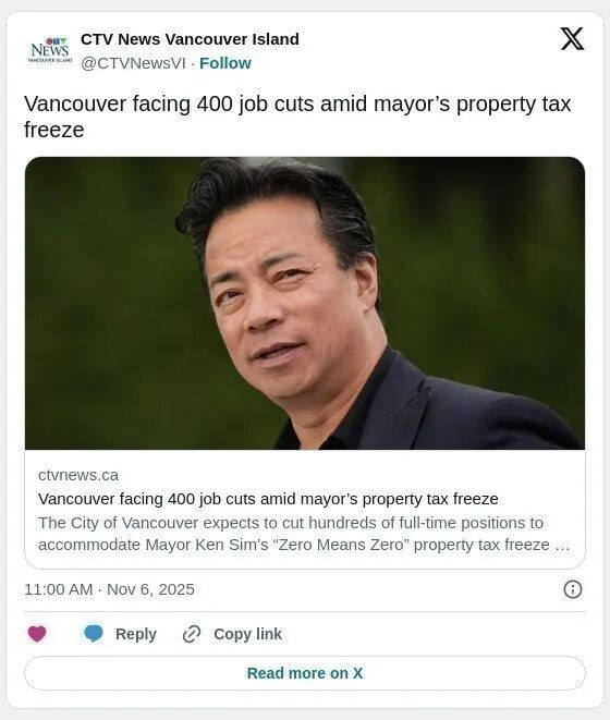 为配合市长沈观键(Ken Sim)提出的 2026 年“零增税”政策(Zero Means Zero)——即物业税(地税)冻结的计划,温哥华市预计将裁减数百个全职职位。