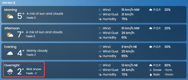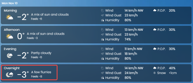 接着在周日(11月9日)白天气温最高2°C,可能会有间歇性的雨或雪,夜间气温降至-3°C,体感-8°C,降水概率上升至60%。