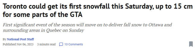 虽然目前地面温度仍然较高,多伦多的降雪可能不会长时间积存,但在其他地区,降雪可能会停留更久,积雪较为显著。