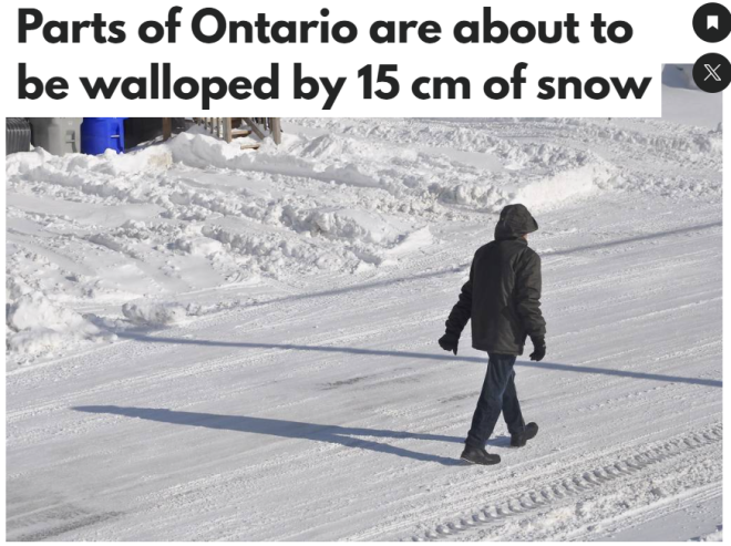 ECCC警告称,安省北部和东部地区,包括Timmins、Cochrane、Kapuskasing等地,周五的降雪量可能会达到15厘米。降雪期间,预计“局部地区能见度接近为零”,到当天下午晚些时候或傍晚会逐渐减弱。