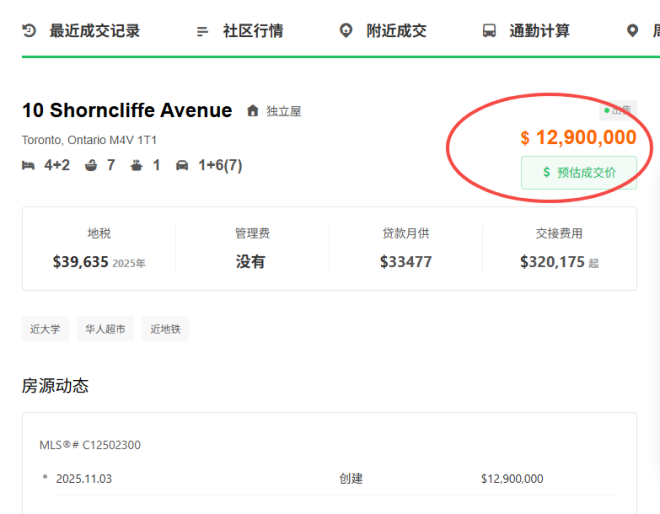 据51找房数据显示,10 Shorncliffe Ave. 最近刚刚挂牌上市,售价1290万。