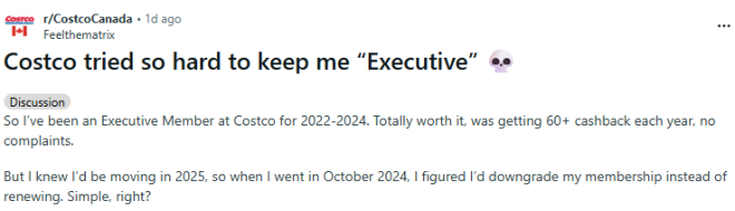 近日,Reddit论坛的加拿大Cotsco话题下有网友发帖吐槽:去Costco请求会员降级(从Executive降级到Golden),遭到员工的百般阻挠,最后走到“绝路”。