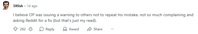 当然,也有网友对帖主的吐槽表示理解:“我觉得帖主只是想提醒大家别犯他同样的错误,并不是在抱怨或想让Reddit帮他解决问题(我个人是这么理解的)。”