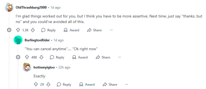有人接着回复说:“(当对方说)‘你可以任何时间取消…’,(你就应该回)‘那太好了,就现在吧!’”
