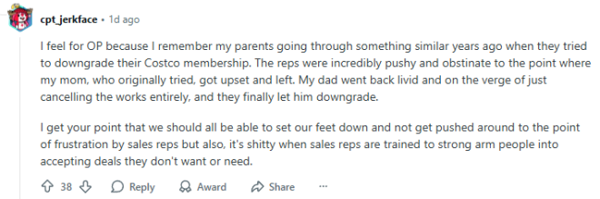 有一位网友也有过类似的经历:“我非常理解帖主的感受,因为我记得几年前我父母也遇到过类似的情况,当时他们想降级Costco会员。销售代表非常咄咄逼人、固执己见,以至于我妈妈一开始就想降级,结果被他们气得直接走了。我爸爸气得不行,又回去,差点就把所有会员都取消了,最后他们才终于同意降级。”