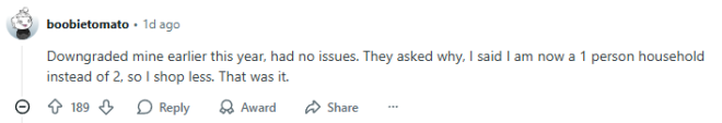 下面这位网友说:“我今年年初就降级了,一点问题都没有。他们问我为什么,我就说现在一个人住,不像以前两个人,所以买得少了。就这样,轻松搞定。”