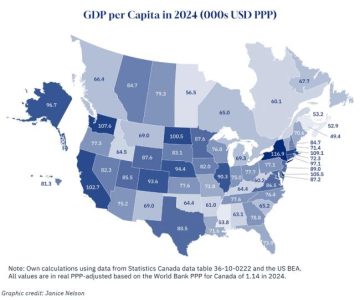 幾天后,加拿大統計局發布了2024年各省經濟數據。這些年度數據經過人口、經濟規模及價格差異調整,可用於與美國各州進行綜合對比。