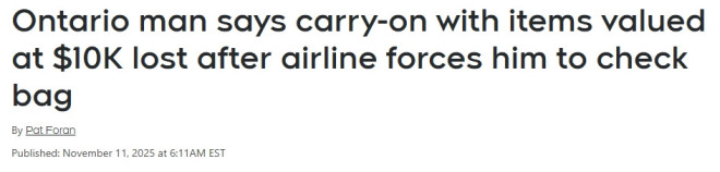 大多伦多一名男子在登机前被迫托运行李后,损失了价值上万加元的贵重物品。