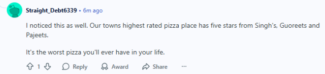 “我也注意到了这一点。我们镇上评分最高的披萨店,Singh’s、Guoreets 和Pajeets都给了五星好评。但这绝对会是你这辈子吃过最难吃的披萨。”