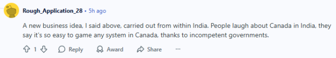 对此现象,一位似乎很懂印度人的网友指出:“这是一个从印度内部开展的新商业点子。在印度,人们常拿加拿大开玩笑,说在加拿大搞任何事情都很容易‘钻空子’,因为政府太无能了。”