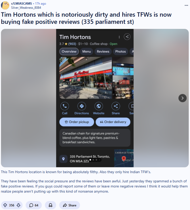 近日,Reddit论坛上的“LMIA欺诈”话题下,有网友曝光多伦多一家Tim Hortons正在Google Reviews上狂刷好评。
